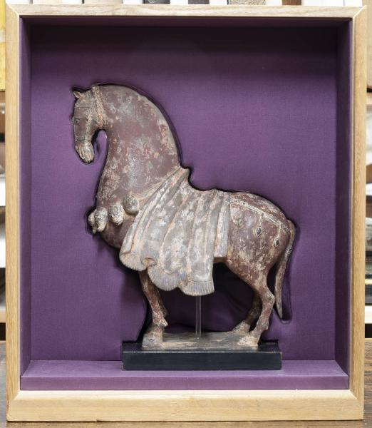 - NOTIZIE STORICO CRITICHE Donata da Giacomo Manzù nel 1982, questa scultura rientra nella tipologia della ceramica cinese Tang Sancai (Dinastia Tang, 618- 907 d. C.). Il cavallo giocò un ruolo significativo nell'unificazione dell'Impero cinese, poiché per la sua grande velocità permetteva agli antichi di comunicare con paesi vicini e lontani. Non solo, il nobile destriero aiutò l'esercito a conquistare terre lontane e far crescere l'impero. Mentre cresceva il desiderio di razze più forti e più veloci, gli antichi cinesi importarono cavalli dall'Asia centrale, creando la famosa Via della seta. Le immagini dei cavalli abbondano di pittura, letteratura e scultura. Durante la dinastia Tang, gli artisti riproposero l'effigie del cavallo come arte funeraria: statuette simili erano utilizzate come corredo funerario per rendere più piacevole la vita ultraterrena. Dai modelli originali vennero realizzate numerose repliche tra cui quella in Accademia Carrara, con ogni probabilità di fattura ottocentesca.