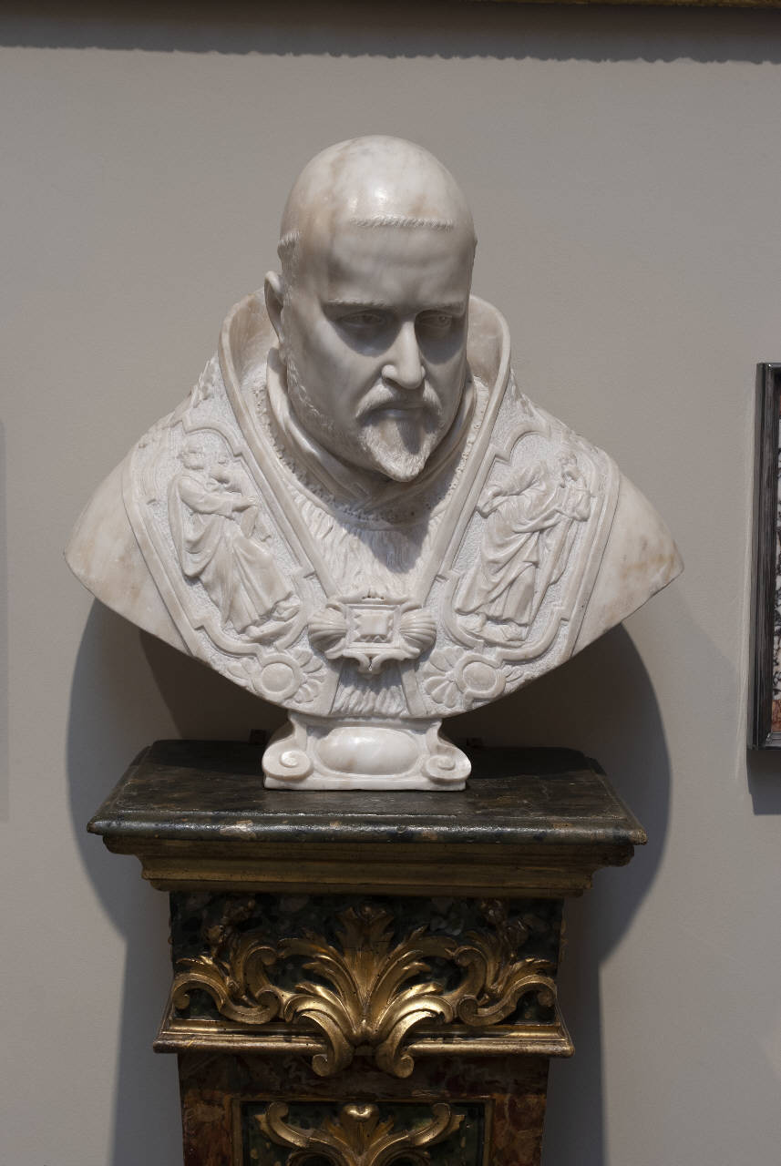 - NOTIZIE STORICO CRITICHE Papa Paolo V Borghese è ritratto a capo scoperto, abbigliato con un prezioso camice dai bordi ricamati da cui emerge un morbido amitto. Sopra, un piviale minuziosamente riprodotto decorato con le figure di S. Pietro e S. Paolo, è chiuso sul petto da un fermaglio con gemma centrale.\nForse il più significativo ritratto scultoreo dedicato a papa Borghese prima dei capolavori berniniani, questo piccolo busto marmoreo deve ad A. Bacchi ("Il conoscitore d'arte: sculture dal XV al XIX secolo della collezione di Federico Zeri", 1989, pp. 28-29) l'attribuzione a Nicolas Cordier, scultore lorenese molto affermato in ambiente romano prima dell'arrivo del giovane Bernini. Le capacità ritrattistiche del Cordier dovettero essere particolarmente apprezzate da Paolo V, visto che gli affidò, oltre che la realizzazione della monumentale effigie pontificia in bronzo richiesta dalla città di Rimini, anche l'incarico di sostituire la testa inginocchiata del papa impiantata da Silla Longhi di Viggiù al centro del suo monumento funebre nella Cappella Paolina a Santa Maria Maggiore, un ritratto mai applicato. Proveniente da Spoleto, dove fino al 1980 circa si trovava a palazzo Pucci della Genga, l'opera della Carrara è un capolavoro della maturità del Cordier, probabilmente realizzata tra il 1610 e il 1612 circa, in ogni caso dopo il 1605, data dell'elezione a pontefice del Borghese. Nell'Inventario dei beni dell'artista, stilato all'indomani della sua morte, al numero 65 figura una "testa in marmo di papa Paolo" (Pressourye, 1985, p. 429). Tradizionalmente identificata con la testa in marmo che il Borghese aveva commissionato all'artista per sostituire quella di Silla Longhi, non è tuttavia da escludere che si tratti di quella in esame ("Il conoscitore d'arte...", 1989, pp. 28-29).\nCon ogni probabilità lo stesso Bernini usò il busto della Carrara come fonte di ispirazione per il celebre busto "da scrittoio" conservato nella Galleria Borghese.
