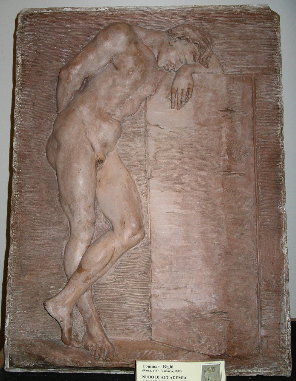 - NOTIZIE STORICO CRITICHE Il bassorilievo raffigura un'accademia di nudo secondo un procedimento compositivo diffuso più fra i pittori che non fra gli scultori. La figura maschile, appoggiata ad un blocco di pietra, è perfettamente finita e marcatamente aggettante e si staglia su un fondo neutro tracciato sommariamente con la stecca.\nSiglato "T. R." in basso a destra, il rilievo in esame, insieme agli altri tre conservati sempre in Accademia Carrara (nn. inv. 98ZR00032-98ZR00034), risale alla fase giovanile di Tommaso Righi, uno dei più tenaci esponenti della cultura barocca romana, ed è databile tra il 1750 e il 1755 circa, al tempo degli stucchi per l'Abbazia di Grottaferrata, eseguiti nel 1754 ("La donazione Federico Zeri", 2000, pp. 68-69).