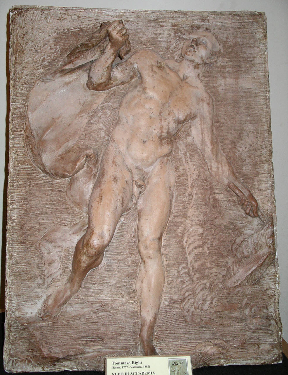 - NOTIZIE STORICO CRITICHE Il bassorilievo raffigura un'accademia di nudo secondo un procedimento compositivo diffuso più fra i pittori che non fra gli scultori. La figura maschile, perfettamente finita e marcatamente aggettante, è in piedi e regge nella mano destra un drappo. Il fondo è tracciato sommariamente con la stecca.\nSiglato "T. R." in basso a sinistra, il rilievo in esame, insieme agli altri tre conservati sempre in Accademia Carrara (nn. inv. 98ZR00031-98ZR00033), risale alla fase giovanile di Tommaso Righi, uno dei più tenaci esponenti della cultura barocca romana, ed è databile tra il 1750 e il 1755 circa, al tempo degli stucchi per l'Abbazia di Grottaferrata, eseguiti nel 1754 ("La donazione Federico Zeri", 2000, pp. 68-69).