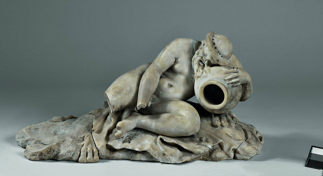 Sileno dormiente appoggiato su un'anfora; sulla base è distesa la pelle di un leone; il retro reca un foro forse per deflusso dell'acqua. La base è costituita da tre pezzi.