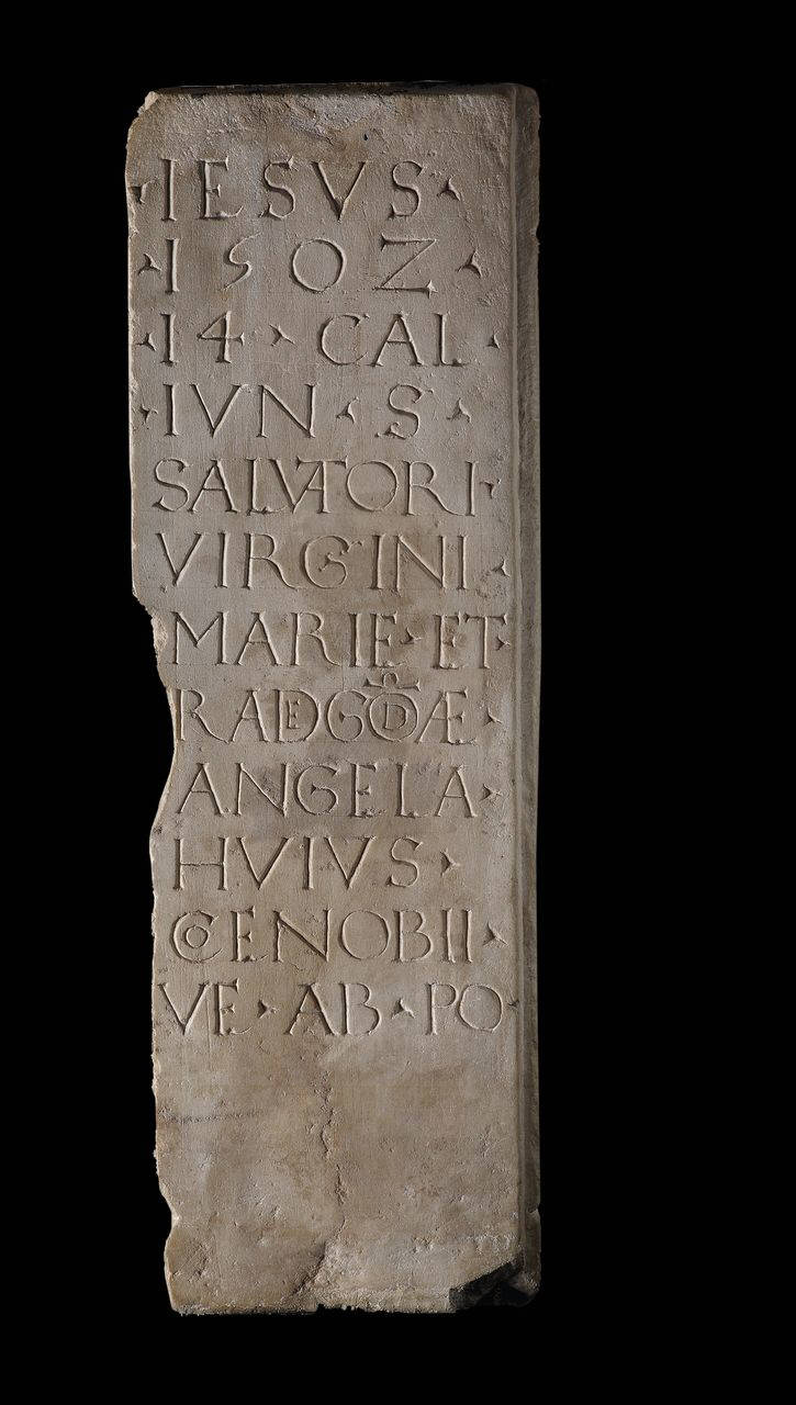 Lastra rettangolare con iscrizione commemorativa di Angela, badessa del convento di Santa Radegonda, reimpiego della lastra inv. 459