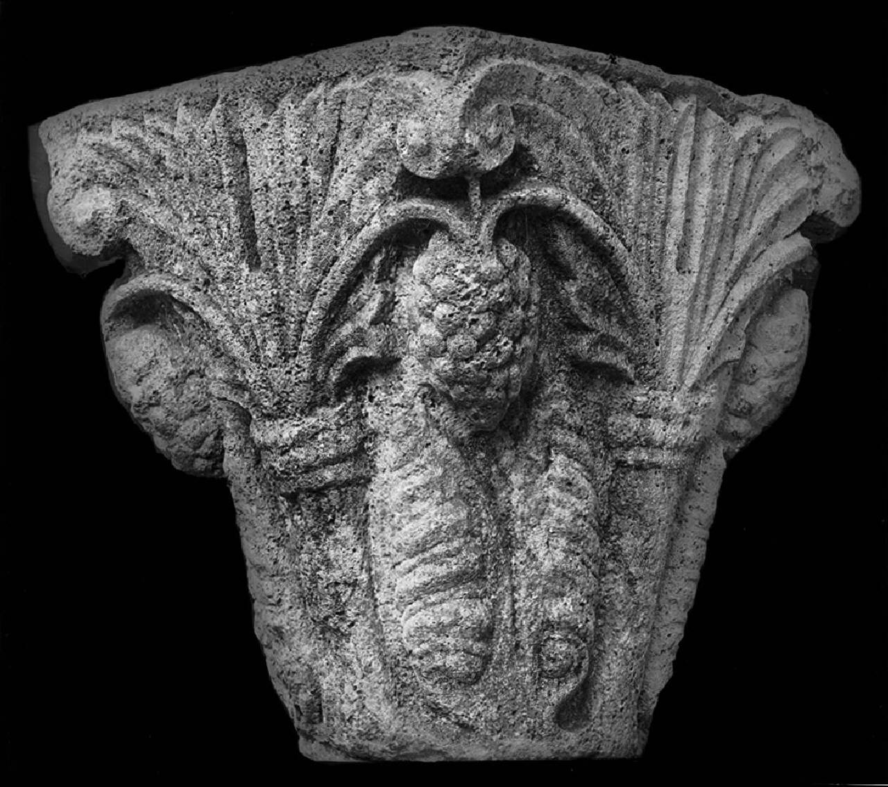 - NOTIZIE STORICO CRITICHE Capitello per colonna isolata. Nei quattro campi, un albero di palma, sorgente dal collare s'espande nella parte superiore, e forma una doppia voluta allo spigolo e, sotto, la voluta, grappolo d'uva: ai lati del palmizio due conchiglie fusiformi (?) o pannocchie.\nAltezza cm. 38;\nAcquistato nel 1893 da un antiquario.\nSec. XII (?)