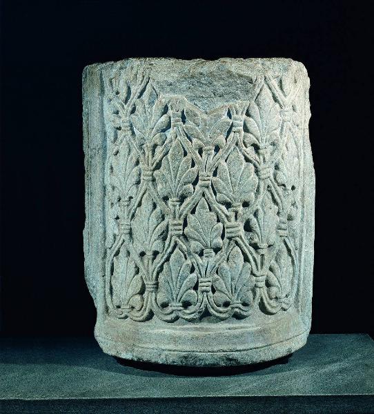 Lastra convessa di ambone decorata con motivo a rete a maglie chiuse ogivali a oppia punta di tralci biviminei contenenti foglie eptalobate