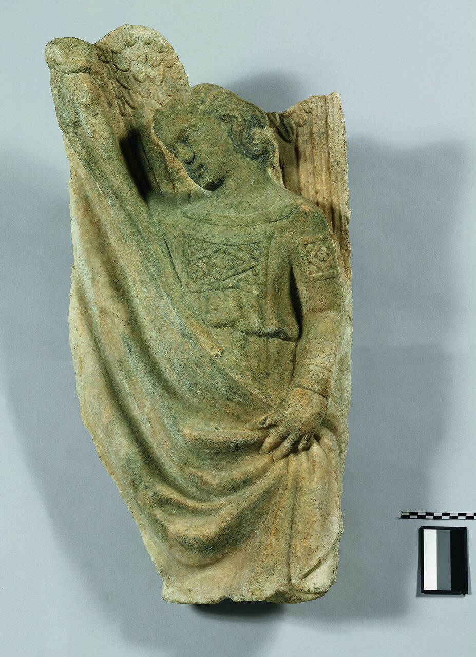 Angelo reggicortina rivolto verso sinistra. La lastra è sagomata intorno alle ali.