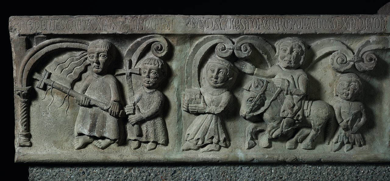 Sezione del fregio della distrutta Porta Romana, raffigurante il rientro dei milanesi in città il 27 aprile 1167. Il corteo è aperto da un ecclesiastico con croce astile e stendardo, seguito da un chierico, anch'esso con croce astile, dietro al quale si sussegue una sequenza di nove personaggi variamente atteggiati (chi in piedi, chi a cavall, chi con in mano contenitori, chi affiancato da cani). Sul listello superiore vi è un'epigrafe in due versi, seguita da una dichiarazione di paternità del'opera da parte dello scultore Girardo.