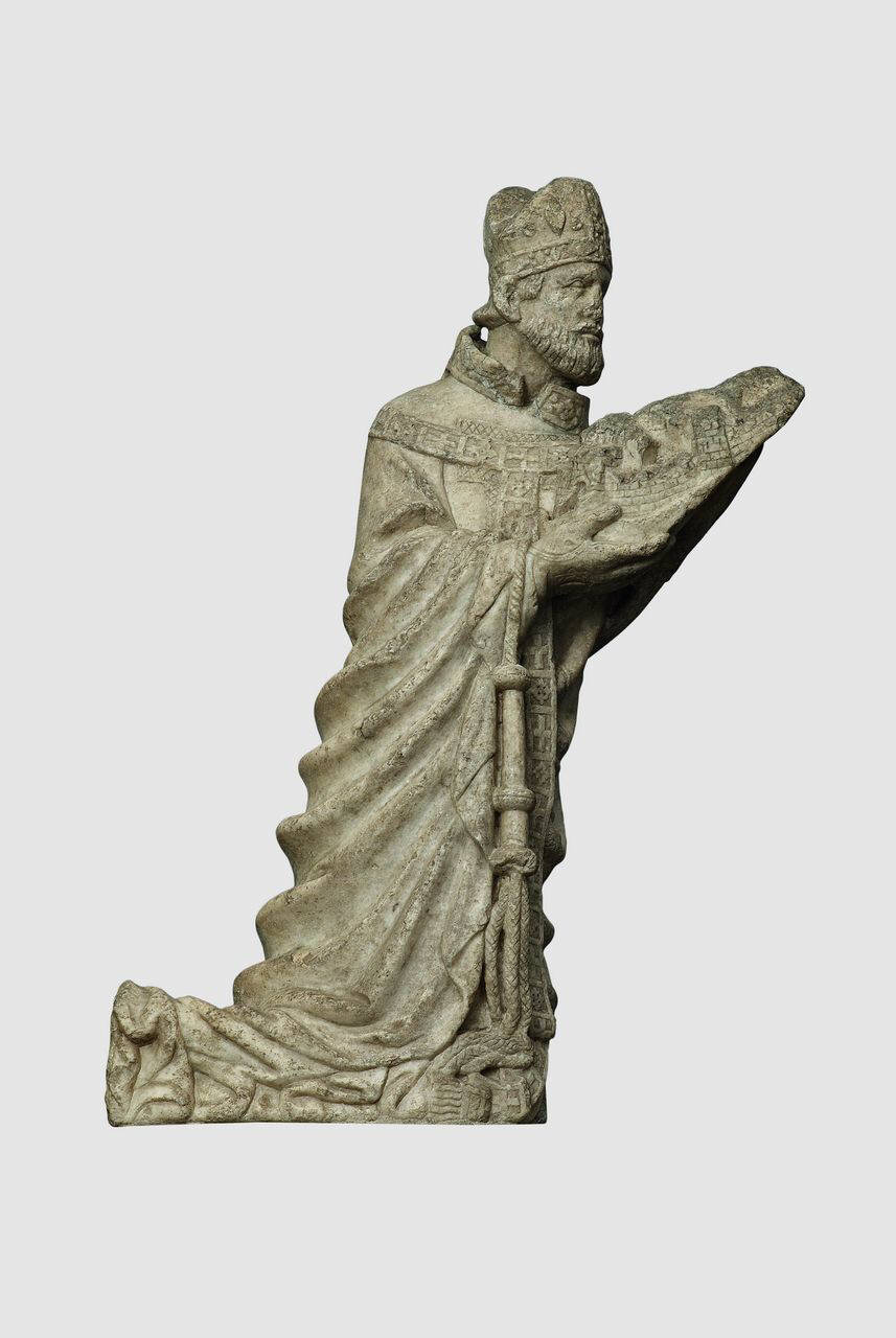 Sant'Ambrogio offerente porge il sestiere di porta ? (su un disco?) . Al braccio destro è appeso lo staffile.