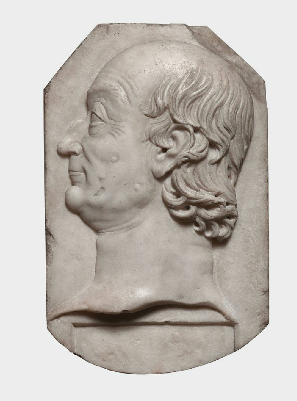 Lastra dal perimetro mistilineo (poligonale la parte superiore, curvilinea quella inferiore) raffigurante la testa di Federico da Montefeltro? di profilo, volta a sinistra.