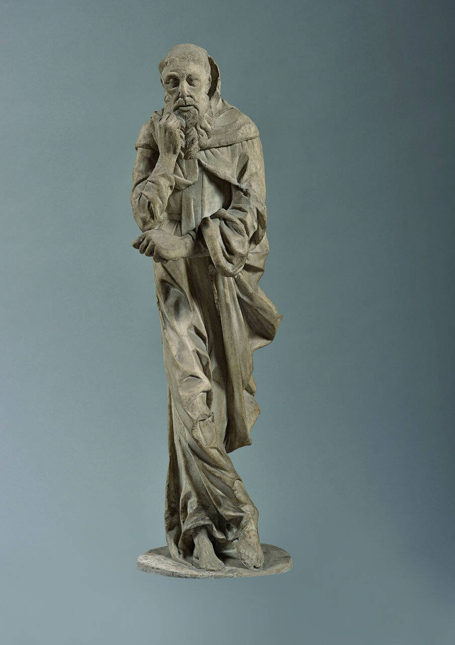 Figura virile, magra e barbuta, con lunga veste; con la mano sinistra e il gomito destro si appoggia ad un bastone , mancante
