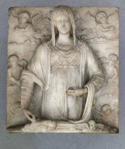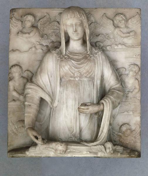 Lastra rettangolare; la Madonna, a tre quarti di figura, sorgente da un nimbo, sta reggendo il Bambino (mancante); sullo sfondo angeli e cherubini.