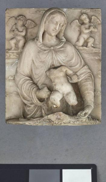 Lastra rettangolare ad altorilievo; la Madonna, a tre quarti di figura, con la mano destra priva delle dita, sorregge il Bambino acefalo, privo del braccio destro, di parte del sinistro (?) e della porzione inferiore delle gambe, in piedi su un davanzale. In cielo due angioletti inginocchiati su nuvole.