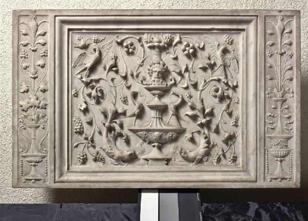 Lastra modanata: al centro, candelabro con piatto di fontana (?) decorato con testa di cherubino accanto a due teste faunesche, sopra il quale stanno due aironi con una serpe nel becco; testa di vecchio barbuto (in alto) e cesto di frutta (alla sommità). Ai lati del candelabro, due mostri affrontati dalle cui code si sviluppano volute floreali con bacche e due uccelli. Ai lati della lastra, due lesene decorate a candelabri con motivi floreali e perline.