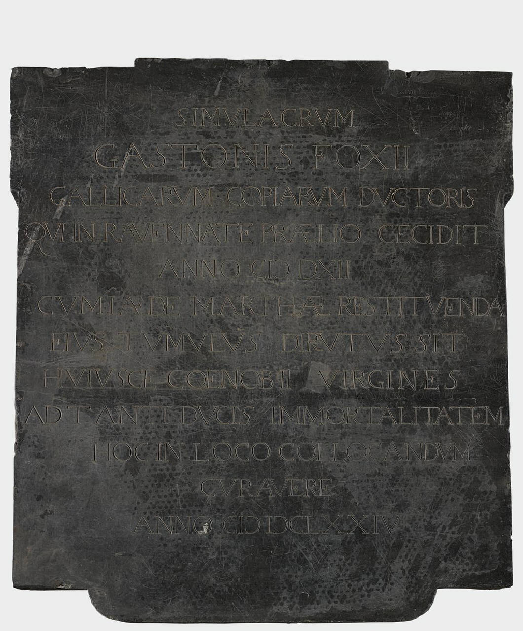 - NOTIZIE STORICO CRITICHE Lapide in marmo nero con iscrizione di Gastone di Foix (Sel. 359) N. 2\nII Lapide in marmo nero con iscrizione, racchiusa fra membrature di marmo d'altra qualità...( Cat. Consulta c.1).