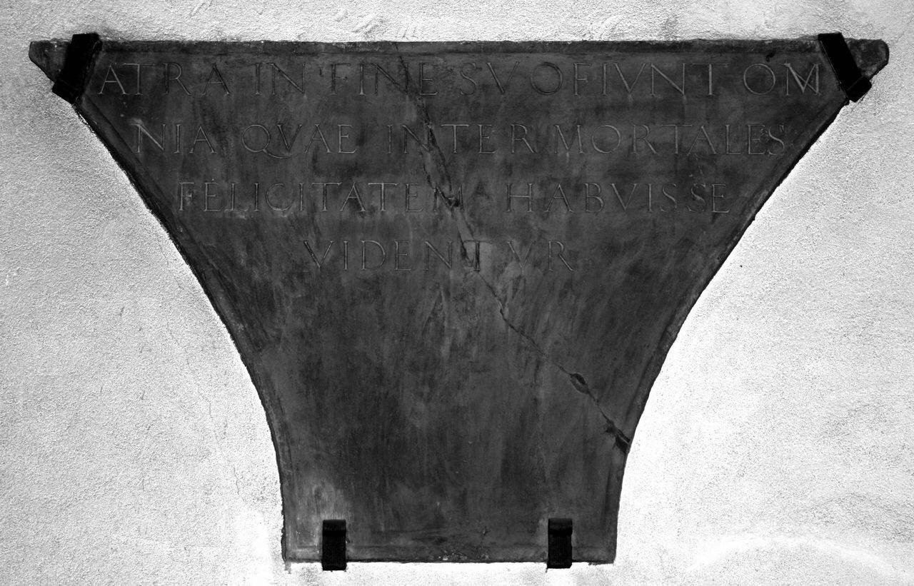 Lastra di forma pentagonale con iscrizione riferita al lamento di Ludovico il Moro per la morte di Beatrice d'Este. La lettera M a destra nella prima riga sembra essere una correzione di una precedente lettera N.