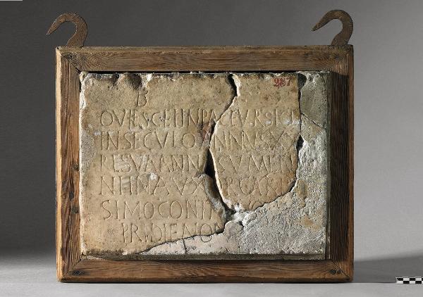 Due frammenti solidali inseriti in cornice lignea. Lastra rettangolare con iscrizione funeraria mutila, dedicata a Ursicenus (Ursicino) dalla moglie Saturnina.
