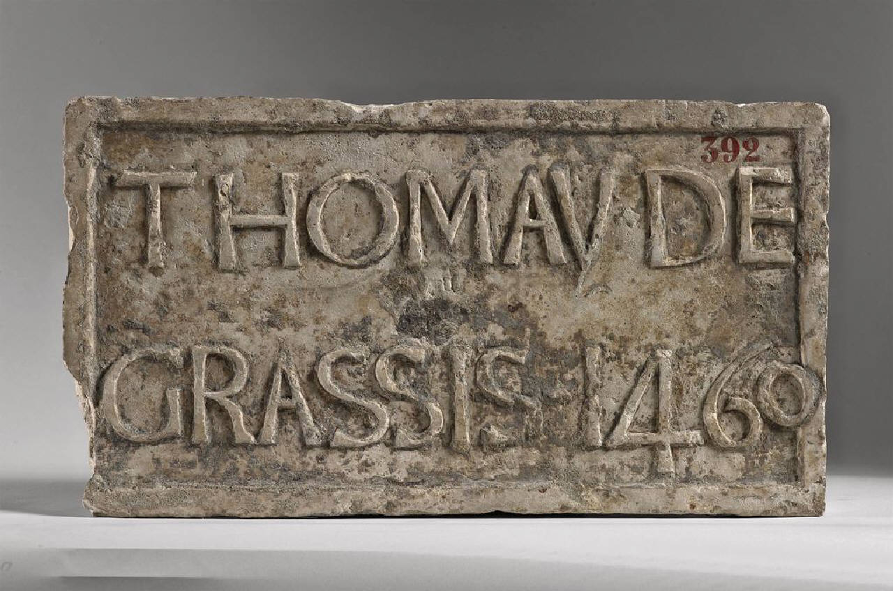 Lastra rettangolare con cornice a listello liscio e iscrizione con il nome di Tommaso de Grassi e la data 1460 in cifre arabe