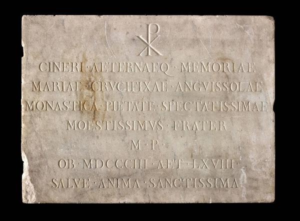 Lastra rettangolare con iscrizione funeraria dedicata a Maria Crocifissa Anguissola dal fratello. Nell'intestazione è presente il cristogramma
