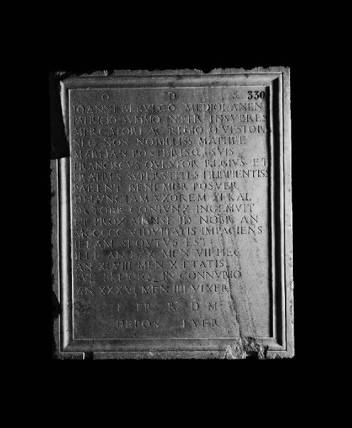 Lastra rettangolare inquadrata nella parte anteriore da cornice, con iscrizione funeraria dedicata ai coniugi Giovanni Beolchi e Mattea Marliani dai figli. l'altro lato reca l'iscrizione funeraria di Alfonso Carloni ( S. 0330 bis Seletti)