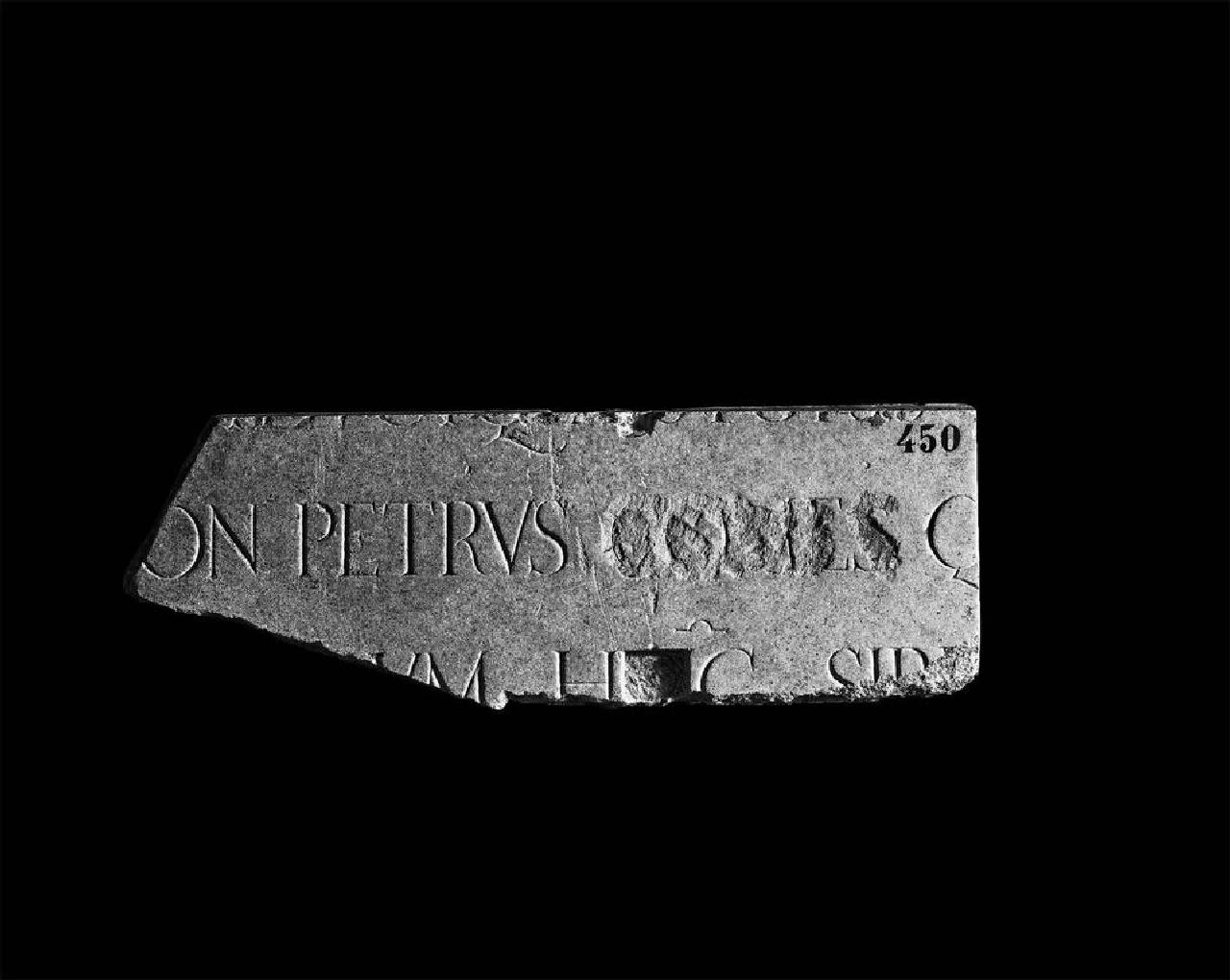 Lastra frammentaria con testo incompleto riferito ad un "Petrus Comes"