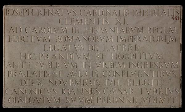 Lastra rettangolare con iscrizione commemorativa del passaggio a Milano del cardinale Giuseppe Renato Imperiali in occasione della nomina a imperatore di Carlo III re di Spagna, e del soggiorno del prelato presso l'albergo della Carità. La targa fu commissionata dal canonico Giovanni Cesare Torre proprietario dell'osteria