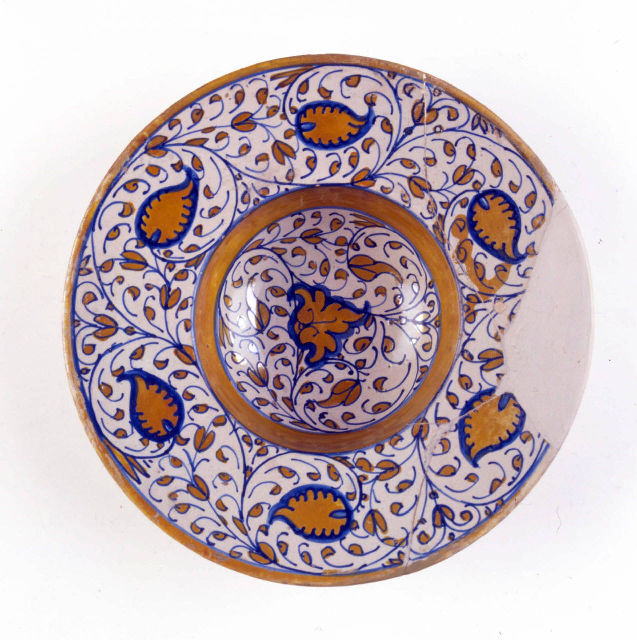 Piatto con profondo cavetto e larga tesa. Foggiato e rifinito al tornio, smalto grigio chiaro, impasto rosa chiaro, dipinto in blu e lustro oro. Al centro decorazione "ad arabeschi vegetali" composta da una grande foglia polilobata e intorno da girali con minuscole foglie e riccioli. Il cavetto è separato dalla tesa da una larga fascia filettata dipinta a lustro. Sulla tesa è replicato il motivo a girali e foglie dentellate. L'orlo, dipinto a lustro, è anticipato da filettatura blu.