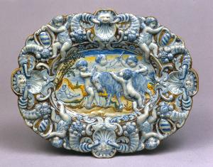 Vassoio ellittico con parte della parete e della tesa a rilievo, orlo mistilineo, base apoda convessa. Foggiato a stampo. Nel fondo quattro putti intorno a una capra, forse intenti a tosarla con l'oggetto che è in mano al putto più a destra. A sinistra personificazione di un fiume. Fra scena e tesa motivo a fiore tra due foglie, tesa con quattro putti alati che reggono scudetti alternati a mascheroni fra due cornucopie. Smalto azzurro all'interno, verdastro all'esterno. All'esterno in corrispondenza di parete e tesa, quattro piantine schematiche in blu. Marca GI.