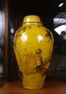 Grande vaso con corpo ovoidale espanso superiormente su base a disco, spalla rigonfia , corto collo cilindrico, coperchio a calotta ribassata e corta tesa. Modellato a colombino con superficie irregolare. Superficie esterna rivestita da smalto giallo, interno con vetrina verde. Decorazione priva di contorni "a libere pennellate" rese a piccolo fuoco in due toni di manganese con effetto monocromo. In primo piano sono zolle rocciose con alberi di specie occidentali e orientali, in secondo piano due uomini che sostengono una portantina con cupola che ospita una donna a seno nudo. La parte restante del vaso presenta un paesaggio con capanno fra palme, faggi e rocce. Coperchio privo di decoro.
