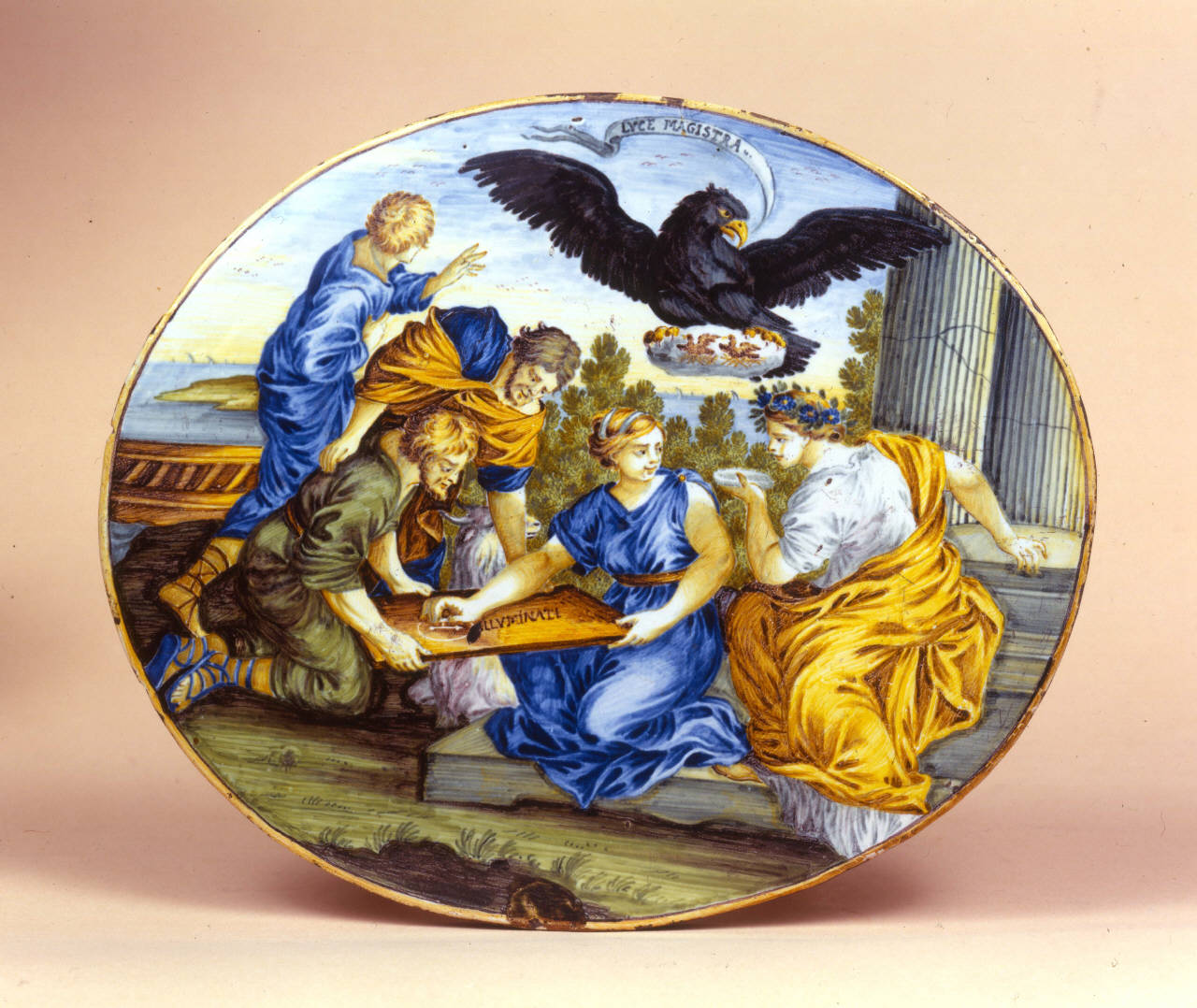 Mattonella ovale profilata con cinque personaggi che reggono una tavoletta, tre giovani e due figure femminili, quella centrale orienta il compasso verso la scritta 'illuminati', in alto è un'aquila che regge un uovo con due aquilotti; sopra iscrizione entro nastro. Dietro al gruppo una capra. Sul fondo veduta marina con vegetazione e a destra due colonne.