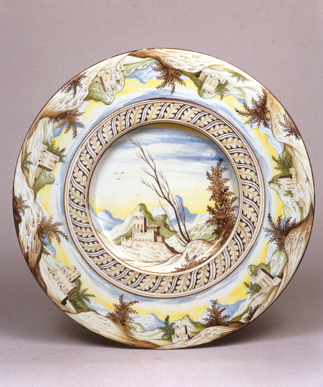 Grande piatto con larga tesa obliqua e base apoda convessa, foggiato a stampo. Smalto azzurro-grigio dipinto in blu, giallo, verde, bruno e manganese. Decorazione distinta in tre aree: nel tondo paesaggio montuoso con edifico turrito, nella parete una fascia a nastro ritorto con motivo a foglie dentellate, nella tesa paesaggio continuo montuoso con sette gruppi di edifici turriti. Sulla tesa del verso cinque piantine equidistanti e al centro la marca GR sormontata da tre archetti in monocromia manganese.
