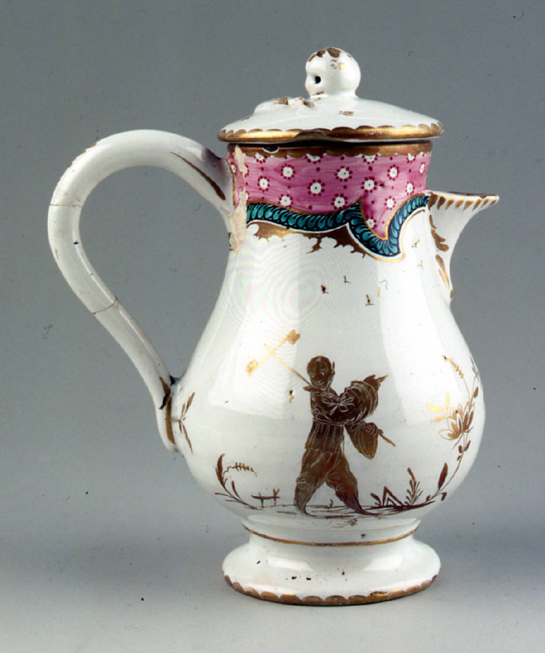 Caffettiera con manico e beccuccio a decorazione simile al numero precedente. Orlo rosa a fioretti bianchi profilato da una treccia verde. In campi opposti, a decorazione oro, figurina cinese maschile fra rade piante con girandola. Coperchio sormontato da pomolo a frutta e foglia a rilievo.