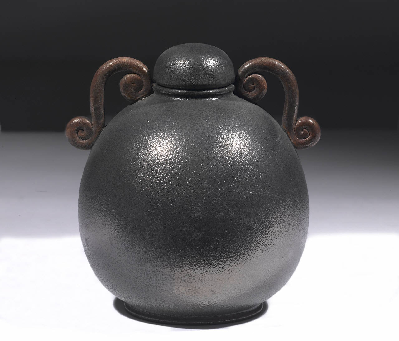 Piccolo orcio sferico su base circolae, coperchio a calatta, manici ad ansa a doppia voluta. Terracotta smaltata a riflesso metallico semimat al terzo fuoco.
