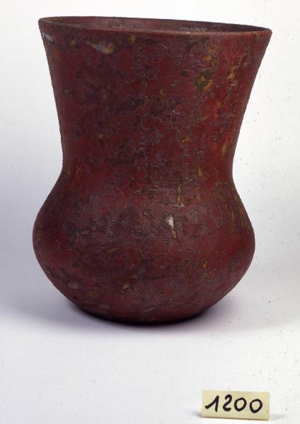 Vaso con corpo basso rigonfio e ampio collo troncoconico svasato. Base con fondo ribassato. Color rosso ferroso con colature di smalto bruno-verdastro.