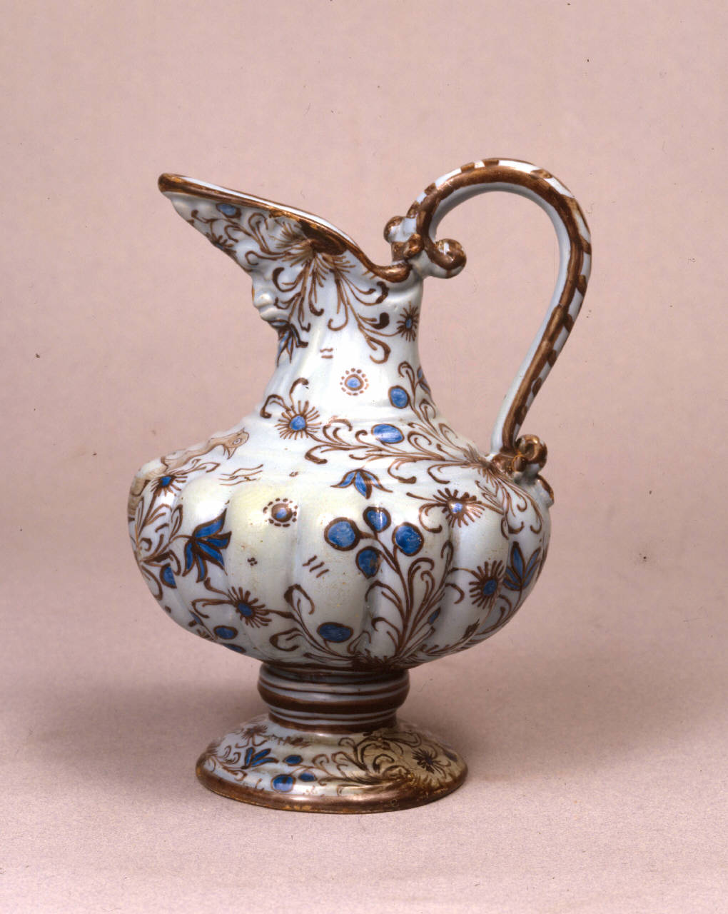 Versatoio a ventre piriforme bacellato, imboccatura a mandorla con mascherone a rilievo sottostante, piede su stelo con nodo mediano, ansa sopraelevata a volute contrapposte. Foggiata a stampo. Nella zona frontale un uccello posto su una zolla di terreno con piante, nel resto del recipiente cespugli con fiori e bacche in blu. Il medaglione a rilievo sotto l'imboccatura risulta ignorato dalla decorazione dipinta. Smalto azzurro, marca assente.