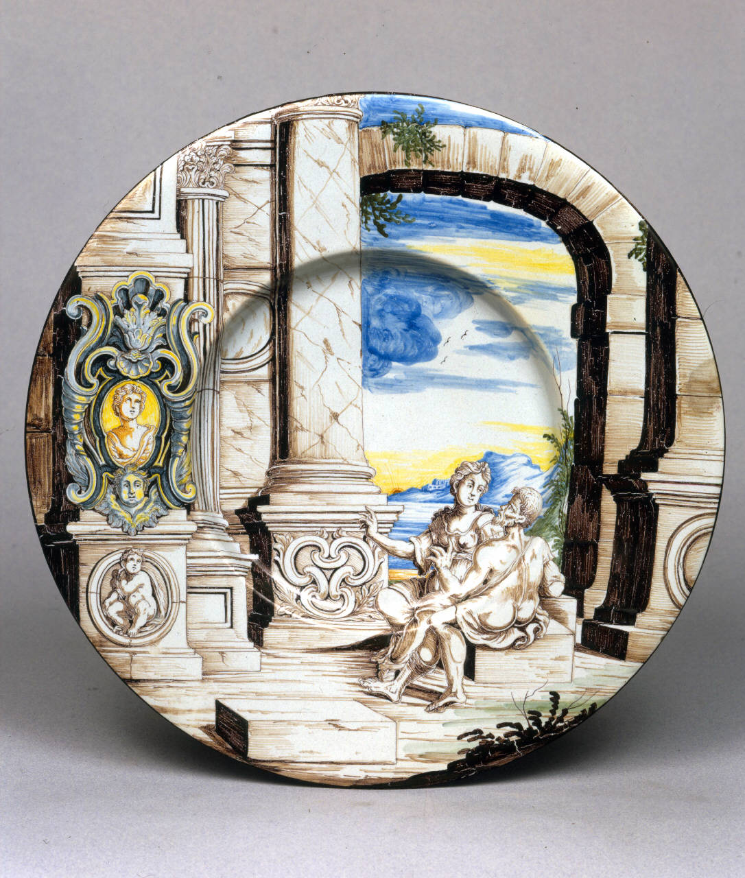 Grande scodella a larga tesa obliqua circolare. Ornata con una scena con rovine e una coppia seduta in primo piano.Verso ornato con piantine stilizzate.