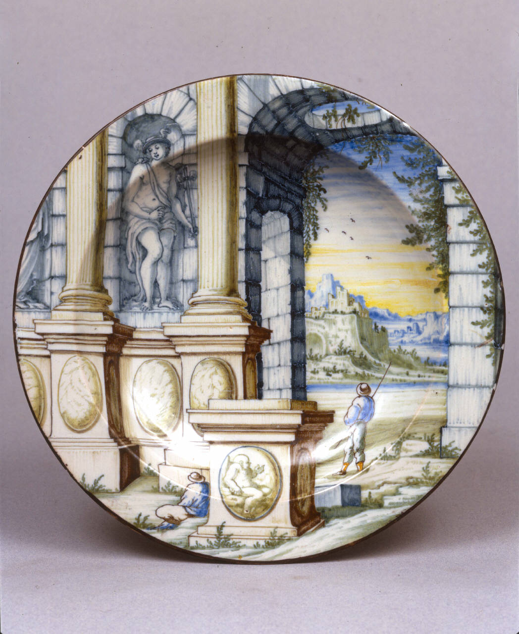 Grande scodella a tesa leggermente obliqua, base apoda poco convessa. Decorazione a tutto campo a rovine monumentali costruite con grossi blocchi, con basamenti a medaglioni in marmo di forma ovale, colonne, nicchie, in una è la statua di Mercurio. Al centro un altro plinto con medaglione, un satiro (?), ai due lati figurine di viandanti. Nello sfondo paesaggio montuoso con edifici diroccati. Smalto bianco dipinto in blu, giallo, verde, bruno e manganese, sottile profilo in manganese. Sul verso, sotto la tesa piantine schematiche in manganese e il monogramma AF sormontato da due rami di palma incrociati, crocetta o spronella e corona.