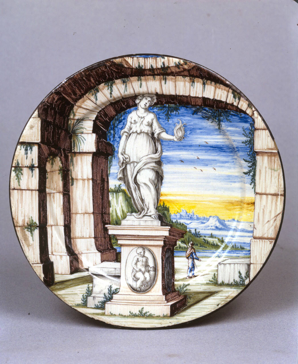 Piatto a tesa leggermente obliqua, base apoda poco convessa. Foggiata a stampo. \nDecorazione a tutto campo a rovine monumentali con un arco ribassato e un'apertura circolare nel soffitto, in primo piano basamento con putto entro medaglione in marmo ovale e sopra statua femminile allegorica, panneggiata all'antica e con fiamma in mano. A lato figurina di viandante. Nello sfondo paesaggio montuoso con abitato. Smalto bianco-azzurro dipinto in blu, giallo, verde, bruno e manganese, sottile profilo in manganese. Sul verso, sotto la tesa, piantine schematiche in manganese e il monogramma AF sormontato da due rami di palma incrociati, crocetta o spronella e corona.