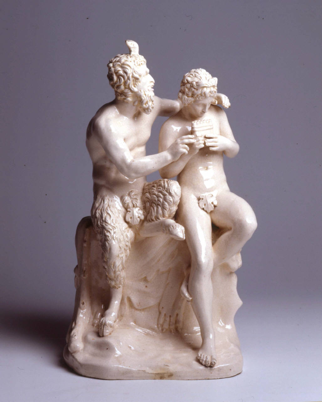 - NOTIZIE STORICO CRITICHE il gruppo riproduce in miniatura un marmo della collezione Farnese con il satiro Pan e Dafni, un soggetto che agli inizi dell'Ottocento ebbe particolare fortuna e fu ripreso in più repliche di piccolo formato. Si conoscono esemplari usciti dalla Real fabbrica di Napoli, dalla manifattura Aldovrandi di Bologna e da quella Giustiniani di Napoli. Intorno al 1830, La possibile assegnazione a Biagio Giustiniani è supportata dal fatto che questi tentò di ampliare il suo mercato introducendo prodotti in porcellana e bisquit ispirati ai marmi della Real Museo Borbonico.