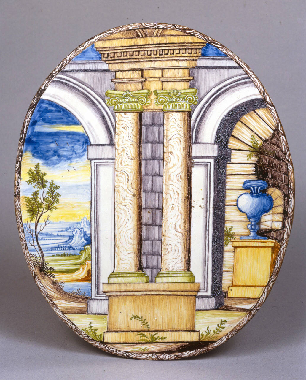 Piastra ellittica piana. Foggiata a stampo. Smalto bianco dipinto in blu, giallo, verde, bruno e manganese, cornice a sottile fascia con racemi schematici in manganese. In primo piano rovine monumentali, due grandi archi intervallati da una coppia di colonne con capitelli e, a destra, su un basamento, un grande vaso. Nello sfondo paesaggio montuoso. Verso rivestito irregolarmente da smalto sottile con striature di foggiatura e aree scure riferibili ai supporti di infornatura. Priva di marca.