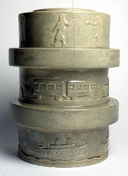 Vaso cilindrico con bocca con piccolo labbro a cordoncino. Il corpo del vaso presenta due anelli a sezione rettangolare che scandiscono la superficie in tre fasce con bassorilievi che raccontano la "conquista dell'Abissinia". La fascia superiore raffigura la partenza per l'Africa con due coppie che si baciano, una madre con bambino che saluta il marito e quattro marinai; la fascia centrale raffigura la partenza dalla stazione di Dire Daua di una locomotiva con al traino un carro di carbone verso le montagne; la fascia inferiore raffigura in viaggio via mare con due piroscafi.