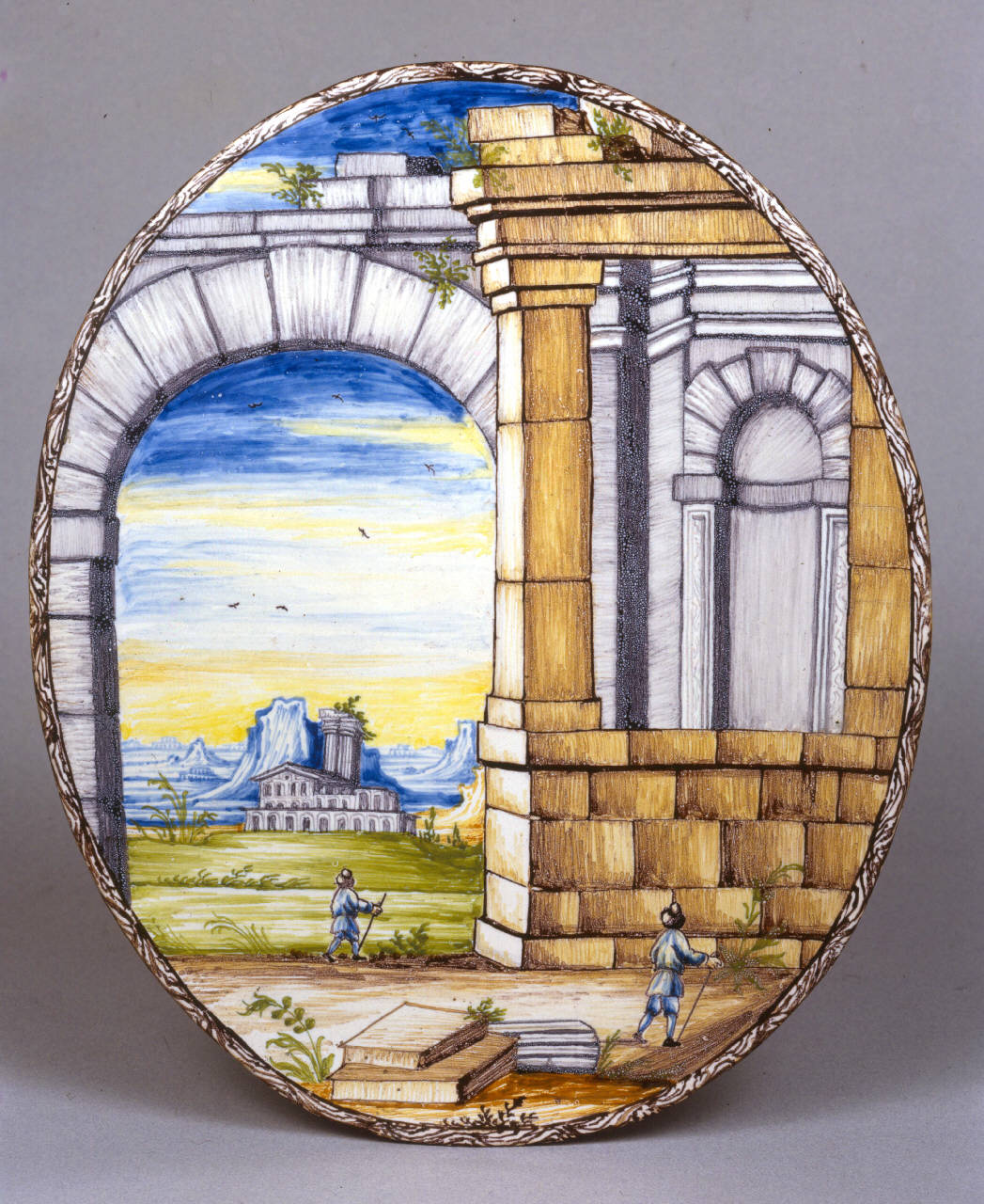 Piastra ellittica piana. Foggiata a stampo. Smalto bianco dipinto in blu, giallo, verde, bruno e manganese, cornice a sottile fascia con racemi schematici in manganese. In primo piano rovine monumentali, un grande arco e un muro di un edificio costruito a grandi blocchi con edicola. Nello sfondo paesaggio montuoso con un grande edificio. Due figurine di viandanti. Verso rivestito irregolarmente da smalto sottile con striature di foggiatura e aree scure riferibili ai supporti di infornatura. Priva di marca.