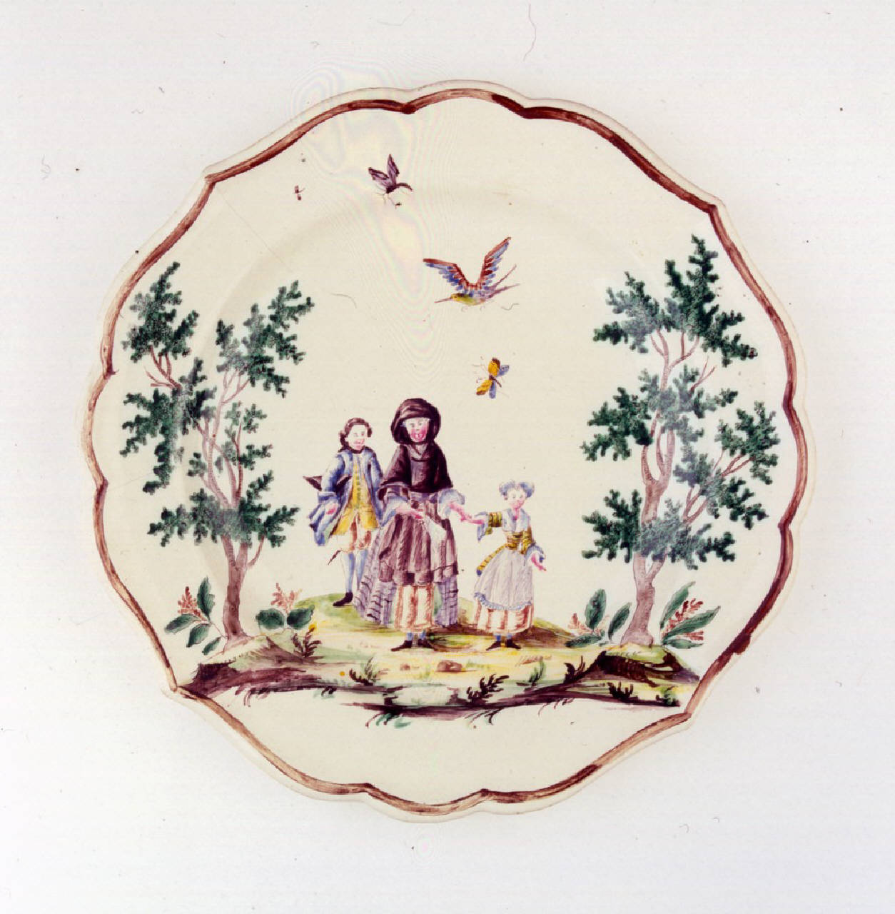 - NOTIZIE STORICO CRITICHE Piatto grande parte di un assortimento formato da centoquarantotto pezzi decorato "a paesini e figure a smalto" (cfr. Inventario manifattura Clerici 1788, A.S.M., Commercio 199), databile dopo il 1756, anno di adozione della tecnica a piccolo fuoco nella manifattura. A questa raccolta appartiene un piatto con la marca di Felice Clerici e la data 1767 (n. INV. 2338) (cfr. Ausenda, in Museo Arti, 2001).