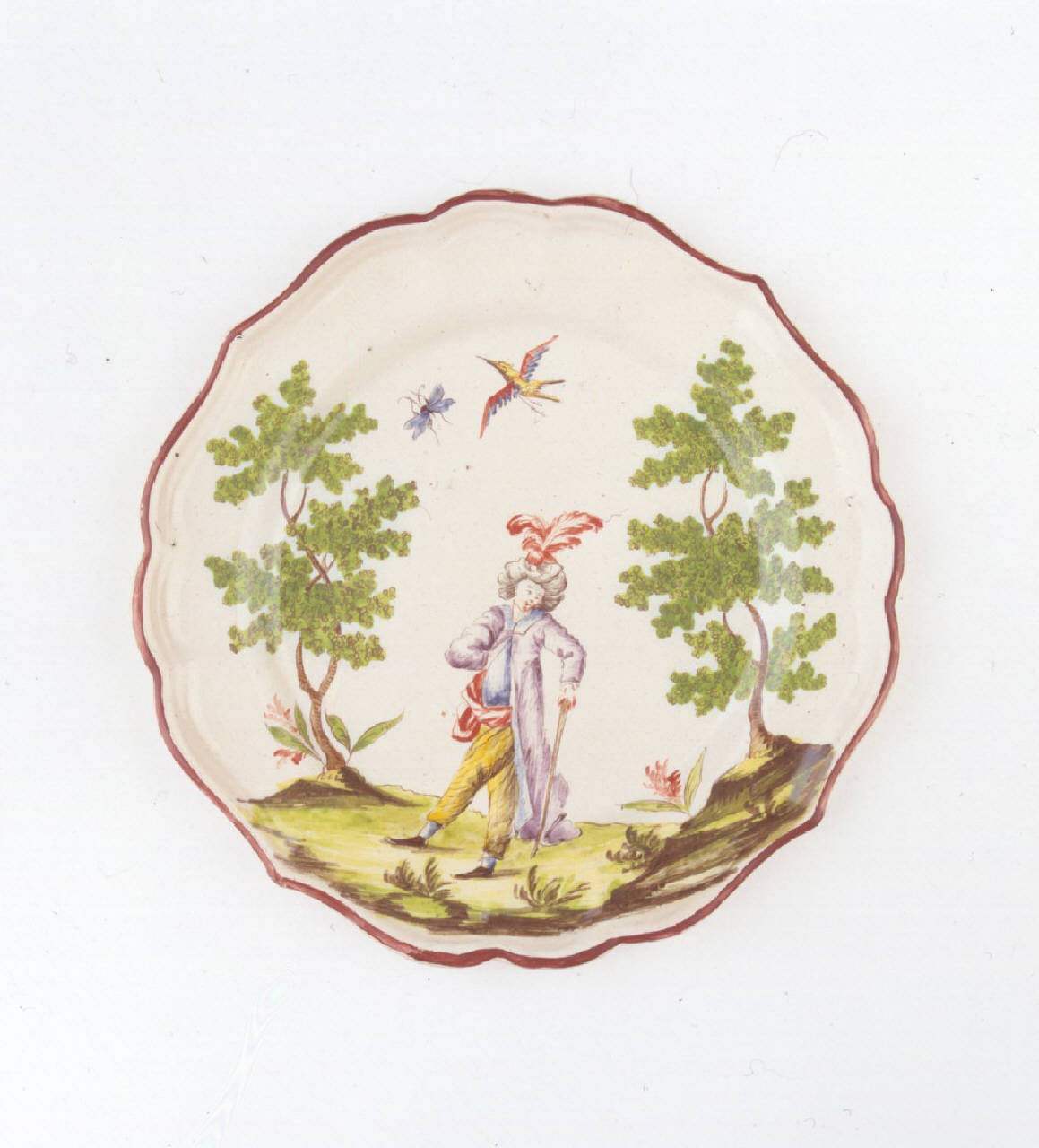 Piatto medio sagomato a quattro punte con orlo color bruno ornato con figura di giovane con vesti orientali tra due alberi.
