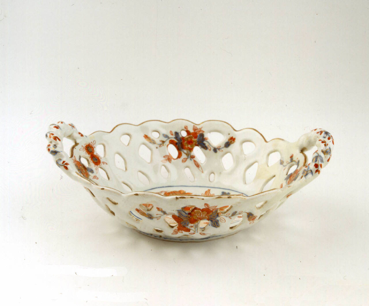 Cestello ovale, svasato, traforato a giorno con manici intrecciati. Decorazione policroma e oro di gusto giapponese. All'interno, incorniciati da un filetto blu, da un terreno, emergono due rami turchini con peonia centrale e altri piccoli fiori. Sulla spalla quattro piccoli gruppi floreali con peonia centrale affiancata da tre fogliette blu da cui si dipartono steli sinuosi con fiori. Orlo profilato in oro.