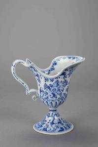 Versatoio a casco su base a calice, ansa a nastro arricciata all'attacco della vasca. Decorazione monocroma blu di cobalto con motivo "a merletto" di margherite e motivi fogliati stilizzati. Filettature e ovoli alla base della vasca.