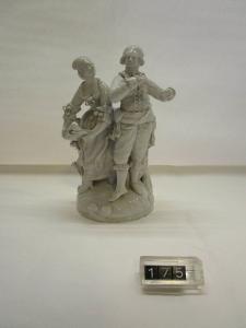 Gruppetto a smalto bianco di due figure stanti, una femminile con una mandola e una maschile con un flauto, su base ovale con tronco d'albero e una pianta di rose. Mancano un pezzo di manico di mandola e un pezzo di flauto.