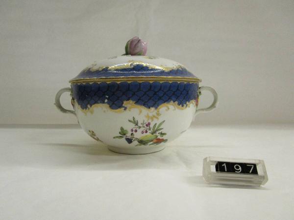 Tazza da brodo con due manici ad orecchio desinenti in foglie e fiorellini. Sul bordo fascia di alveoli neri delimitati ornati in oro. Nei campi opposti decorazione policroma gruppi di frutta con intorno fiorellini sparsi. Coperchio a decorazioni similari con presa a foggia di rosa rilevata con gambi e foglie. La tazza presenta un'incrinatura trasversale.