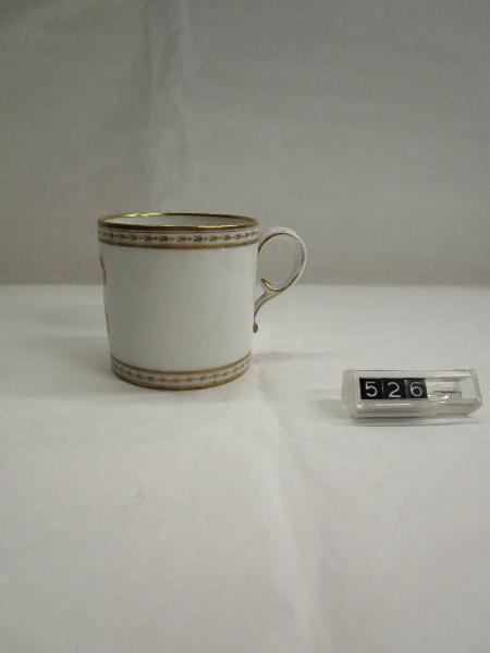 Tazza cilindrica con manico ad ornati. Fregio superiore e inferiore di foglioline d'oro entro doppia filettatura. Al centro della tazza la lettera S, come un serpente attorcigliato, in rosso su bianco.