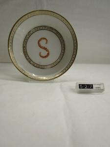 Piattino con tesa rialzata. Orlo e giro interno decorati in fregio di foglioline dorate entro doppia filettatura. Al centro la lettera S, a forma di serpente attorcigliato, in rosso su fondo bianco.