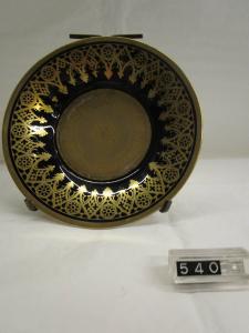Piattino con tesa a fondo turchino decorata di fregi in oro in gotico fiorito. Disco centrale in oro con piccoli disegni graffiti e filettatura in oro sull'orlo. Tazza corrispondente inv.539