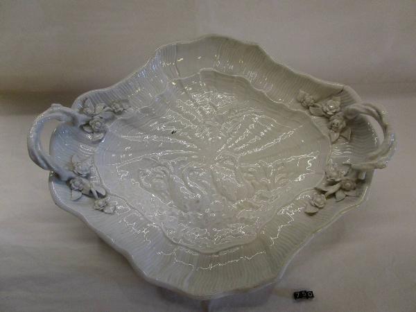 Vassoio ovale a smalto bianco, con manici intrecciati desinenti a tralci o di fiori. Tesa ondulata lievemente con riserva liscia su un lato. Nella parte centrale, sono raffigurati, a basso rilievo, due cigni, posti l'uno di fronte all'altro, in un contesto lacustre; sopra di loro un airone in volo.